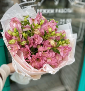 Этот букет воплощает нежность, элегантность и чувственность. Задумчиво составленные альстромерии, с их изящными контурами и пастельными оттенками, создают мягкое и романтичное настроение. Изящная паковка, украшенная деликатным атласным бантом, придает этому букету финальные штрихи приятности и нежности. Уникальность этого букета заключается в его способности подарить волшебный момент чистой радости и нежной любви.